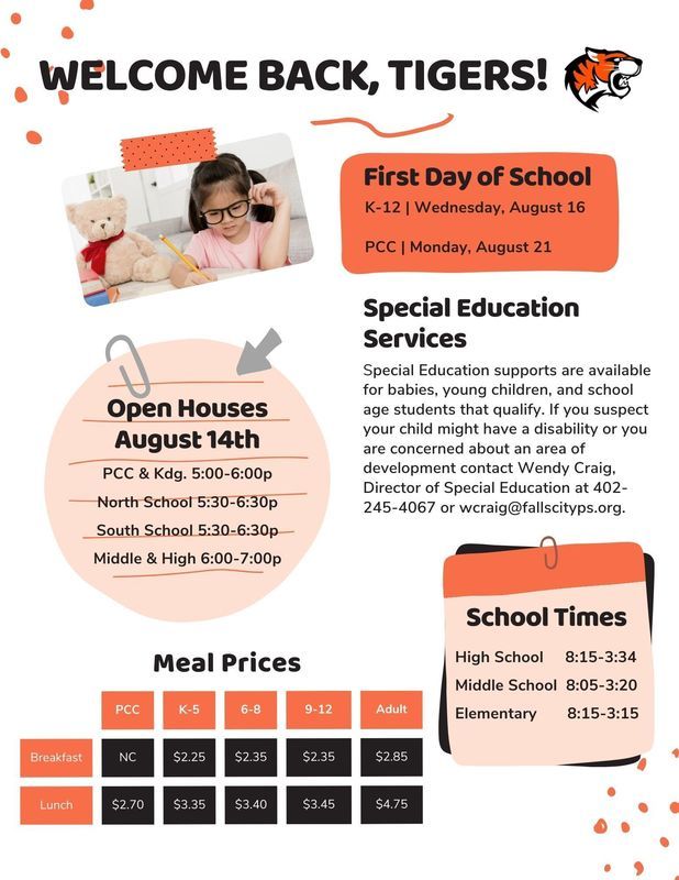 Falls City Public Schools would like to welcome everyone back for the 2023-24 school year! The attached image includes helpful back-to-school information. Please follow the links below to access additional documents provided by the district.
